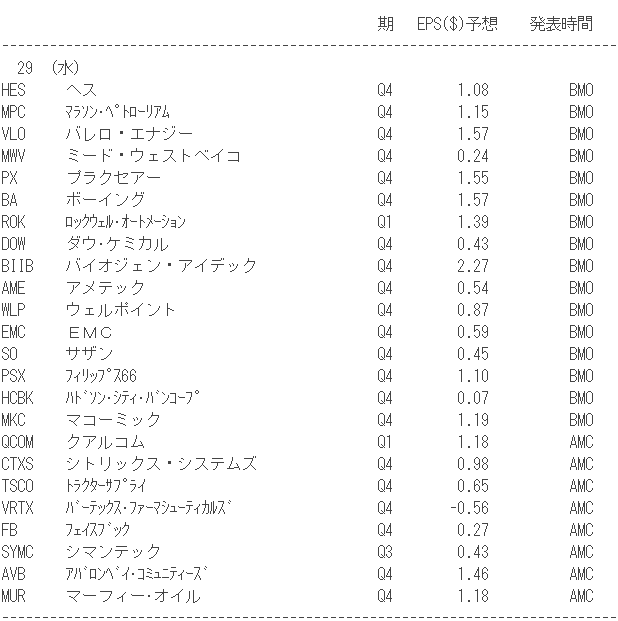 米決算発表予定(1/29)-今晩はボーイング、ダウ・ケミカル、クアルコム、フェイスブックなど
